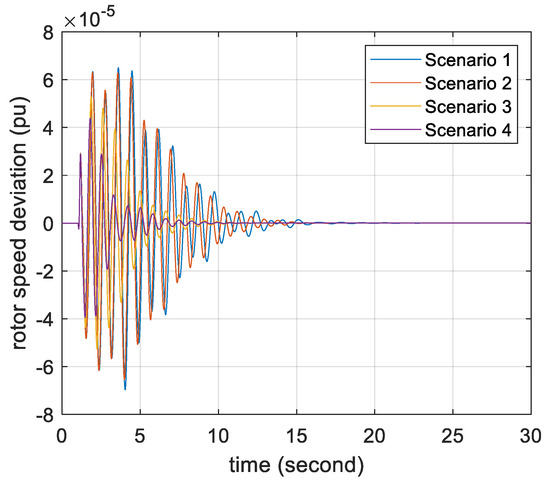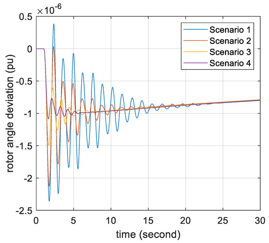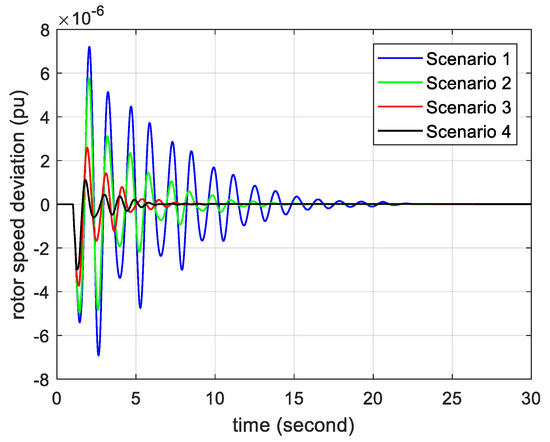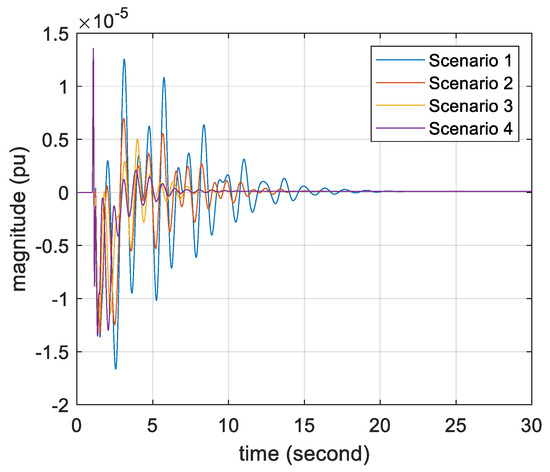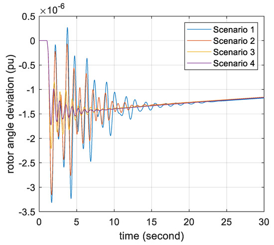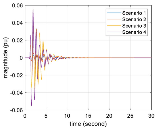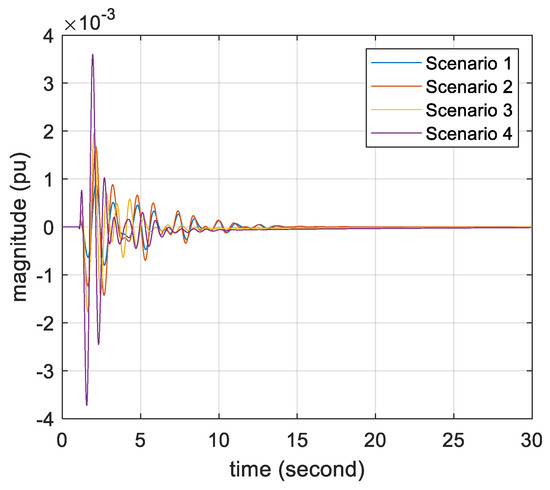 This section focuses on the modal analysis of the Java, Indonesia power grid with the underlined scenarios, and it is given in Table 2. This analysis can be conducted by investigating the damping ratio of the targeted EM modes. In this paper, only local mode 2 and interarea mode were investigated since they were identified as critical modes in the Indonesian grid by the initial simulation studies. Figure 5 illustrates the damping ratio comparison under different scenarios. It is evident that the best damping performance was observed in Scenario 4. This could have happened because BESS, wind, and PV produce appropriate active and reactive power to the grid with the proposed MMC. To validate damping performance analysis, time-domain simulations were carried out. To observe the oscillatory condition of the system, a small disturbance was produced in the system by giving a 0.01 step input to the load. Figure 6 shows the rotor speed responses of G3 for various scenarios, while the rotor angle responses of G3 are given in Figure 7. In addition, Figure 8 shows the rotor speed response of G4, and Figure 9 shows the rotor angle response of G4. Rotor speed oscillation of G3 settled at 6 s with the proposed control, while the rotor speed oscillation of G4 settled at 7.5 s with the proposed controller. Figure 6 and Figure 8 results show that the rotor speed oscillations of G3 and G4 took longer for Scenarios 1–3 than for Scenario 4. Similar trends could be observed for the rotor angle responses of G3 and G4 with the proposed MMC. Some deviations from the initial condition were observed due to the absence of the governor system in the synchronous generators.