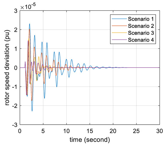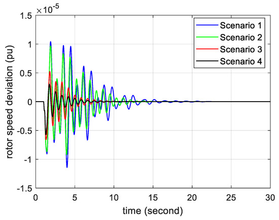 For further investigation, the system was tested against large disturbances. These tests were carried out by applying a three-phase fault in the transmission line between Areas 1 and 2. Figure 10 and Figure 11 depict the rotor speed responses of G3 and G4, respectively. Figure 10 and Figure 11 results show that the rotor speed oscillations of G3 and G4 settled at approximately 10 s when using the proposed control scheme (i.e., Scenario 4). In the large disturbance situation, the proposed method (Scenario 4) was still superior to the other scenarios, as stated in Table 2.
