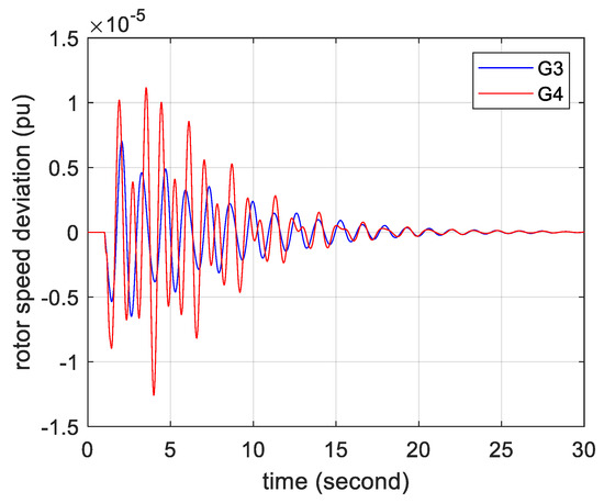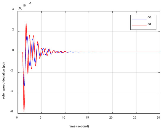 Figure 15 illustrates the rotor speed responses under loss of control signals, while Figure 16 shows the rotor speed responses of G3 and G4 under WECS (i.e., wind) and BESS controller failures. Higher rotor oscillations were observed for controller failure than for the loss of control signal. However, oscillations settled down within 15 s.
