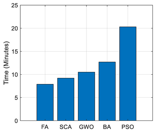 The proposed metaheuristic method (Scenario 4) is compared with other well-known metaheuristic methods (particle swarm optimisation, sine cosine algorithm, grey wolf optimiser, and bat algorithm) to assess its effectiveness. Figure 17 compares the execution time between the proposed metaheuristic method compared with particle swarm optimisation (PSO), sine cosine algorithm (SCA), grey wolf optimiser (GWO), and bat algorithm (BA). The proposed method’s execution time was faster (e.g., 7.6 min) than that of other methods. From the given results, it is evident that the execution time of the well-known PSO method was almost three times faster than that of the FA method. If the size and complexity of the system increase, the execution time is also expected to increase. It is thus recommended to use the algorithm with shorter execution time and high accuracy.