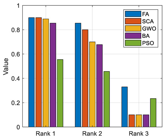 Figure 16 shows the superior performance of the proposed metaheuristic method over the PSO, BA, SCA, and GWO in all three ranking indices. However, all methods do not provide satisfactory results in the simplicity ranking.