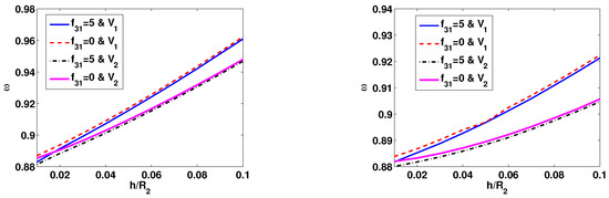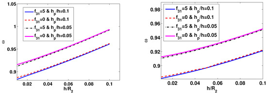 Figure 4 (left) and (right) illustrate the effect of piezoelectric layer thickness on the frequency of considered nanoshell for the case of clamped-clamped and simply supported boundary conditions. Based on these figures, with increasing the