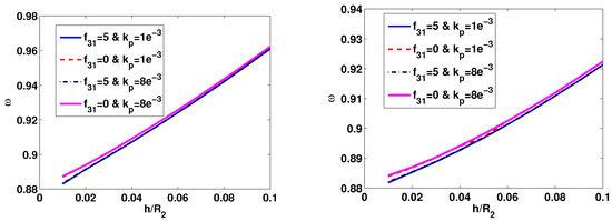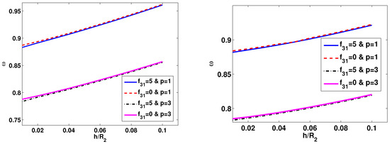 , based on these two figures, with a higher number of volume fraction coefficient and flexoelectric term, the considered nanoshell shows the lowest frequency of oscillations in comparison with other cases, presented in the figures.