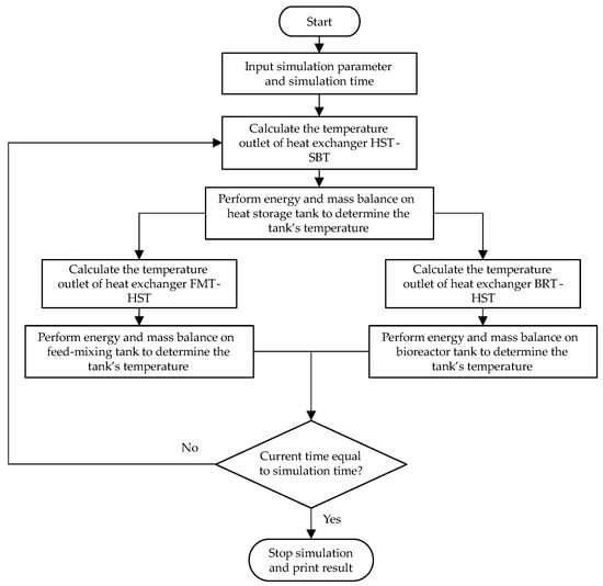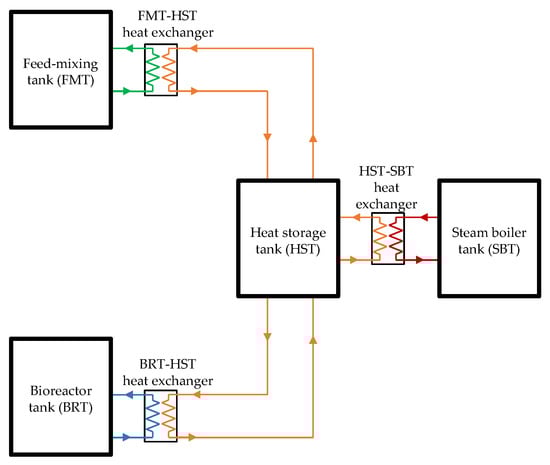 Figure 5 (the hot side of the heat exchanger). The cold side was filled with the fluid from the heat storage tank. The flow of the heat-transfer process from the steam boiler to the bioreactor and feed-mixing tanks can be described as follows:
