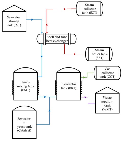 The critical components of the biohydrogen production system that this study investigates are the heat-exchanger, feed-mixing, and bioreactor tanks. The role of the bioreactor tank is the production and collection of hydrogen through the WGS chemical reaction. The feed-mixing tank is where Thermococcus onnurineus NA1 is cultured before sending it to the bioreactor. The working fluid used in the model, i.e., the cultured Thermococcus onnurineus NA1 mixed with water, can be treated like seawater, as it has a salinity of 3.5%. The heat-exchanger tank is used to exchange heat with the primary heat source to heat the bioreactor and feed-mixing tanks to the desired operating condition.