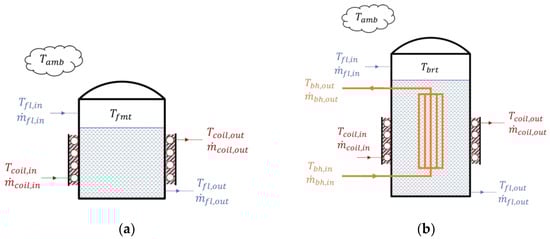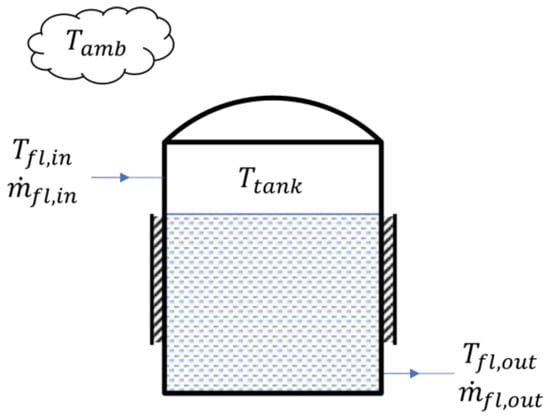 Here, is the temperature of the fluid inside the tank; is the volume of the fluid inside the tank; is the specific heat capacity of the fluid inside the tank; and are the mass flow rates at the inlet and outlet of the tank, respectively; and are the temperatures at the inlet and outlet of the tank, respectively; is the overall heat-transfer coefficient between the fluid inside the tank and the ambient air; and is the ambient temperature.