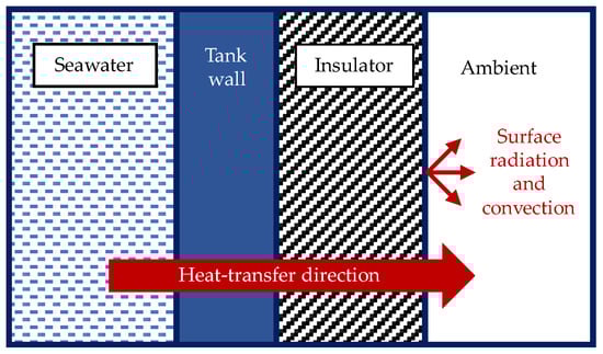In these equations, is the convective heat-transfer coefficient of the fluid in the tank, is the convective heat-transfer coefficient at the ambient air and insulator interface, is the heat-exchange area of the tank wall, is the heat-exchange area of the insulator, is the thickness of the tank wall, is the thickness of the insulator, is the thermal conductivity of the tank wall, is the insulator thermal conductivity, is the Rayleigh number, is the Prandtl number of the fluid inside the tank, is the radiative heat-transfer coefficient at ambient, is the emissivity of the insulator, is the Stefan–Boltzmann constant, and is the surface temperature of the insulator.