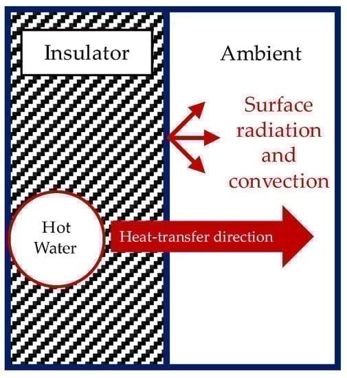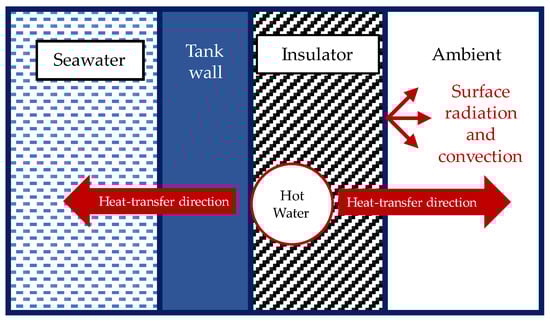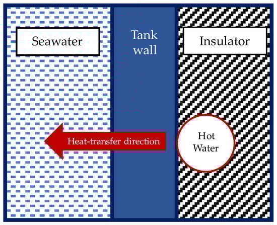 Figure 9 shows the directions of the heat transfer between the coil heater, the fluid in the tanks, and the ambient air. A one-dimensional thermal resistance circuit analysis was conducted at the wall of the tank covered by an insulator and a coil heater to determine the heat loss to its surroundings. For the heat transfer from the coil heater to the tank wall, it was assumed that 20% of the whole coil heater was in contact with the tanks, while the remaining area was in contact with the insulator. The fluid inside the coil heater was water at 90 °C.