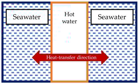 Figure 10 illustrates the heat-transfer direction from the water inside the coil heater to the fluid inside the tank. The overall heat-transfer coefficient for the heat transfer from the coil heater to the fluid inside the tank is shown in Equation (11). Furthermore, the pre-calculation indicated that the flow inside the tank was laminar. In terms of geometry, the cylinder tank wall in this system model could be treated as a flat plate for the thermal resistance circuit analysis since the condition for the present case study was satisfied according to Equation (12) [