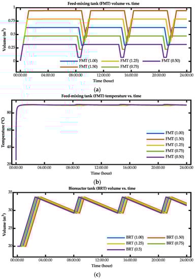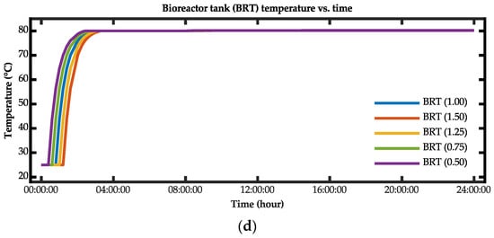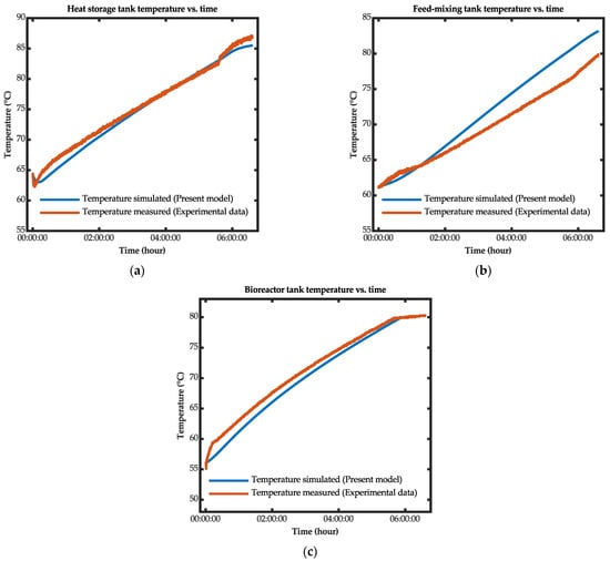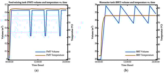 The developed dynamic equations for determining the temperatures of the feed-mixing tank and the bioreactor tank in the bio-IGCC model are expressed in Equations (9) and (10), respectively.