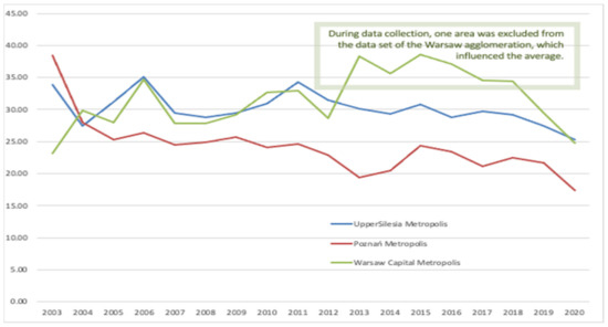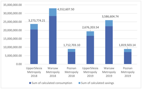 Table 1 demonstrates that the choice of the Warsaw district heating system as the reference point is justified, because of the comparable length of the network (which is only 17% smaller), the cubic space of the heated buildings (which is 37% higher in Warsaw than in the GZM Metropolis) and the volume of the sold heat, which is 25% larger in Warsaw, although with its 19% lower value per 1 dam.