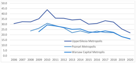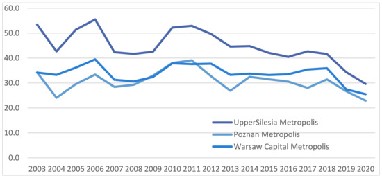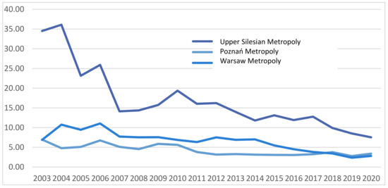 In the further part of this study, the term “GZM Metropolis” or GZM denotes the group of counties which are part of it. The boundaries of the Upper Silesian and Zagłębie Metropolis which were established in 2017 covering 41 municipalities, including 13 towns with the rights of a county and 13 urban municipalities. It can be represented as the Upper Silesian conurbation consisting of major Polish cities, by presenting it as a group of adjacent cities in Śląskie Voivodship, including Gliwice, Zabrze, Katowice, Bytom, Świętochłowice, Siemianowice Śląskie, Sosnowiec, Dąbrowa Górnicza, Jaworzno, Czeladź, Mysłowice, Będzin, Tychy, Ruda Śląska, Piekary Śląskie, Chorzów, Mikołów, Tarnowskie Góry, and Knurów.