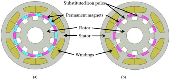 Stator PM machines, such as flux-switching PMs and flux-reversal PMs, have been designed with Vernier machine pole slot combinations to utilize the flux modulation effect. These stator PM Vernier machines have inherent advantages over rotor PM Vernier machines owing to their stator positioned PMs. First, a simple and robust salient rotor is realized and prevention of PM secede which gives robust rotor structure. Second, easy heat management can be applied to PMs because forced liquid cooling can be adopted on the stator with PMs. Third, it has high power density thanks to its PMs and Vernier features. However, their torque and power density are not higher than those of rotor PM Vernier machines because stationary PMs have a limited contribution to the torque density [9,10,11,12,13,14,15,16,17]. The working principle difference between the stator permanent magnet Vernier motor and the rotor permanent magnet Vernier motor is mainly due to two things. First, the position of PMs is opposite. Hence, the flux modulation poles are also opposite, which are stator poles for rotor PM machines and rotor iron poles for stator PM machines. Second, the PMs of stator PM machines do not rotate with the rotor and hence do not contribute to the torque production [18].