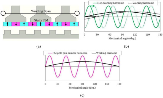 In Figure 2c, the PM pole-pair-number harmonic and the working harmonic are shown simultaneously. Although the PM pole-pair-number harmonic is the source of all the resultant harmonics from the flux modulation, it is stationary because of the stator-positioned PMs. It does not move with the rotor rotation and, hence, does not contribute to torque production.