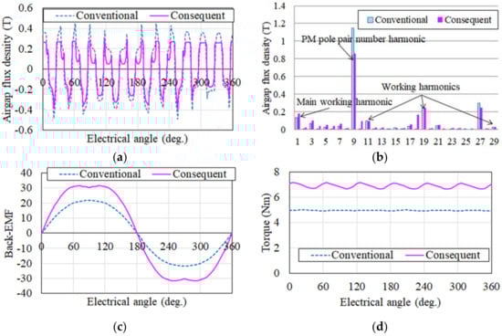 Figure 3a shows the airgap flux density waveform of each machine. In the figure, it appears that the consequent pole machine has a lower quantity than the conventional machine owing to its lower peak values. However, as Figure 3b shows, the main working harmonic of the consequent pole machine, which is the first, has increased compared with the conventional machine. One of the nonworking harmonics, the PM pole-pair-number harmonic, which is the ninth harmonic component, decreased as the PM number was halved compared with the conventional machine. However, the decrement did not affect the torque production because it did not contribute to the torque enhancement owing to its stationary character. As explained in Section 2.2, the harmonics must be moving. Hence, the harmonics that are multiples of the PM number are not considered as they are stationary on the stator. In addition, the working harmonics must have variation of integral quantity with movement in winding span. Considering all these conditions, nonworking harmonics are neglected from working harmonics. Figure 3c,d illustrates the enhancement of the back EMF and, hence, the enhancement of torque with the adoption of the consequent pole structure. This confirms that the increment in torque was caused by an increase in the main working harmonic, while there was no loss from the decrease in the PM pole-pair-number harmonic.