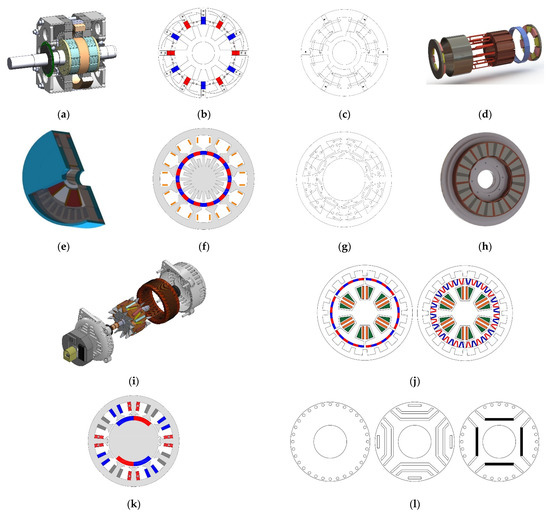 Figure 1. (a) Hybrid-excited synchronous machine with contactless energy transfer [1]; (b) hybrid-excited switched-flux permanent magnet machine [3]; (c) doubly salient machine [7]; (d) axial flux hybrid excitation motor [9]; (e) axial-radial flux machine [12]; (f) dual rotor/stator machine [14]; (g) Hybrid-Excited Machines with DC winding on stator [15]; (h) stator of double stator inner rotor axial air gap flux switching permanent magnet machine [16]; (i) hybrid-excited claw pole generator [17]; (j) hybrid-excited Vernier machine [18]; (k) consequent-pole permanent magnet machines [19]; (l) rotor of induction motor, line-start synchronous reluctance motor, and line-start interior permanent magnet synchronous motor [23]. - Flux-switching machines [3], represented by the hybrid-excited switched-flux permanent magnet machine (Figure 1b), where the iron flux bridge adjacent to the DC filed winding slots is utilized as well to enhance flux-controllability. It has high torque density, sinusoidal back-EMF, and hence, lower torque ripple. In [4], the influence of stator and rotor pole combinations on machine parameters have been theoretically and experimentally tested. Similar designs have been presented in [5,6]. In these papers, the simulation and experimental research of hybrid-excited flux-switching PM machines with iron flux bridges have been presented.