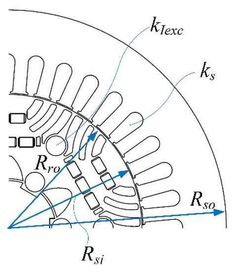 The concept of the HEPMa-SynRM, which was the subject of research, has a structure that combines the features of a PMSM and a reluctance machine, and additionally has the option of regulating the flux with an additional excitation coil [27,28,29]. All the important machine data are listed in Table 2 (see also Figure 2). The outer radius of the stator is 110 mm, the inner stator radius is 68 mm, and rotor’s outer radius is 67.5 mm; thus, the air gap is 0.5 mm. The length of machine is 199 mm. Stator and rotor laminations have been made of silicon steel M400-50A. Two types of high-energy rare earth NdFeB PMs were used in the machine, i.e., with dimensions of 25 × 7 × 2.4 mm (245 pcs.) and 30 × 7 × 2.4 mm (185 pcs.).