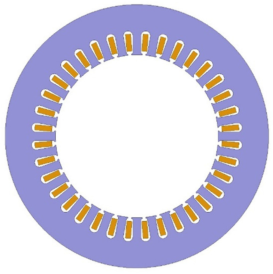 In order to carry out experimental tests, the proprietary rotor of the machine, containing permanent magnets, air barriers, magnetic bridges, and an additional excitation system in the form of DC coils was designed and constructed. Each of the 6 in series-connected DC coils is built of 29 winding wires with a diameter of 0.9 mm, powered by slip rings. The rotor model of the machine is shown in Figure 3. The HEPMa-SynRM machine has a classic stator design derived from the ABB M3AA 132 MC8 squirrel cage induction motor with a power of 6.3 kW. It has 3-phase windings placed in 36 slots (12 per phase). The stator simulation model is shown in Figure 4.