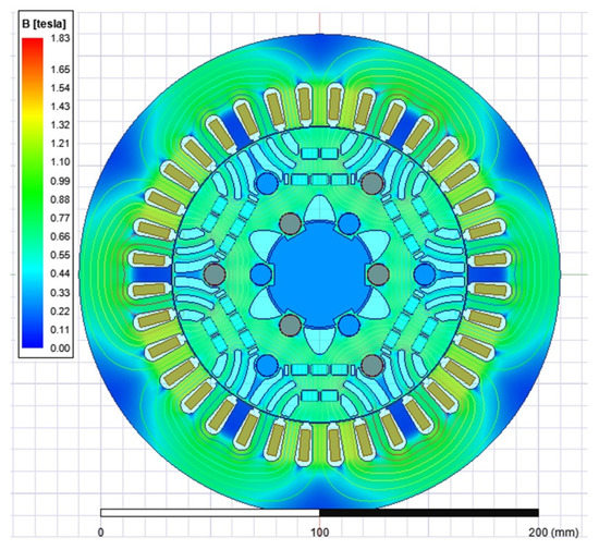 Many simulation tests were performed for the purpose of the research. They were performed using the ANSYS Maxwell software. Finally, the relationships between the back-EMF as a function of the current in the additional coil have been determined and the influence of the excitation current on the cogging torque and the electromagnetic torque has been also investigated. Figure 5 presents a FEM (Finite Element Method) model of the machine (the mesh with 49,519 elements) and the magnetic field distribution within the machine, which was the basis for further calculations. The presented picture shows the motor in a no-load state (zero current in the stator and rotor coils). Due to the small amount of magnetic material, the induction is not high and—as it can be seen in Figure 5—the machine is not saturated. The simulation tests of back-EMF presented in Figure 5 have been performed with the assumption that the rotor was rotating at a speed of 1000 rpm. The results have been obtained for the time of 20 ms with the step 0.1 ms (200 steps). On the other hand, the values of the electromagnetic and cogging torque were determined for load angles in the range from 0 to 180 electrical degrees with the step of 1 degree.