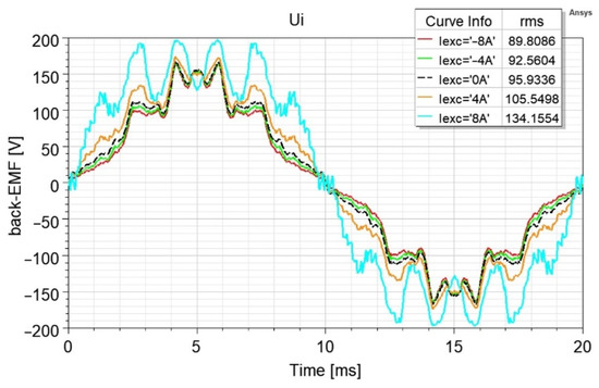 Figure 6 shows the shape of the back-EMF induced in phase A of the machine for different values of the excitation current in the DC coil. The back-EMF has the shape of a strongly distorted sinusoid, which results from the influence of the machine teeth and slots. The noticeable increase in the induced voltage from 95.9 V to 134.2 V, i.e., by approx. 40% can be observed, while de-excitation reduces the voltage to 89.8 V, i.e., by approx. 7%.