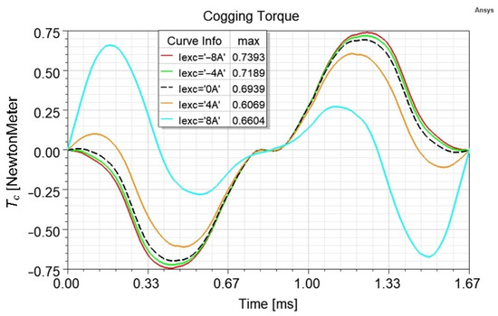 Figure 7 shows the characteristics of the cogging torque value for different values of the DC coil current. It should be noticed that the positive value of the current in the DC coil first causes the reduction of the maximum cogging torque value and then causes the cogging torque to increase. The minimal value of cogging torque is obtained for a current of 4A in the DC coil. It is also significant that in the range of field weakening, the cogging torque always increases with the increase of the current in the additional rotor coil.