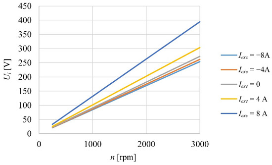 Figure 8 shows the FEM results of the rms value of the back-EMF as a function of the rotational speed of the machine. It can be noticed that the excitation system has better control possibilities in terms of increasing the RMS value of the back-EMF than of decreasing it.