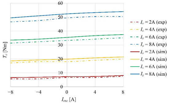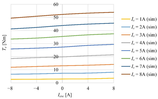 The relationship between the maximum value of the electromagnetic torque Te and the stator current Is and the current in the additional coil Iexc has also been analyzed during simulation calculations. The results are shown in Figure 9.