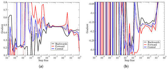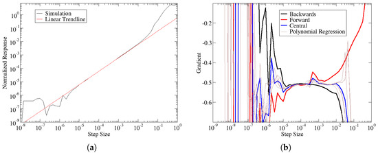 The coefficient of determination, defined in Equation (6), can be interpreted as the amount of variance in the samples that are captured by the fitted polynomial. As approaches 1, the polynomial fit can predict all the variance; when it reaches 1, the polynomial is a perfect fit passing through all the sample points. Figure 3 shows an example of the , which is based on the average coefficient of determination (For every step size, 9 separate polynomial curve fits were generated, along with 9 corresponding coefficients of determination. Instead of plotting all 9 coefficients of determination, we give the mean and standard deviation of these estimates in the plot.) over all the polynomial fits a given step size, along with the estimated gradients. Figure 3a shows that the best agreement between gradient estimates is achieved around a step size of 0.0001. Similarly, Figure 3b indicates the best quality-of-fit around the same step size. Furthermore, as the disagreement between estimates grows over the other step sizes in Figure 3a, we also see that the coefficient of determination statistics deteriorates at the corresponding step sizes in Figure 3b. For the sake of brevity, we only show one comparison between the gradient estimates and coefficient-of-determination. However, this work reviewed all the available data to ensure that the coefficient of the determinant was a robust measure for predicting good agreement between numerical gradients.