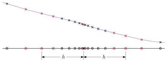 Example of how sample points are selected for polynomial fits. The black line is the ordinate for the design variable, and the blue curve is the response curve. The solid red circle represents the central point in the design space. Open circles represent the different samples on the ordinate. Crosses represent the corresponding points on the response curve. Red markers represent the points selected for a 7-point polynomial fit associated with step h.