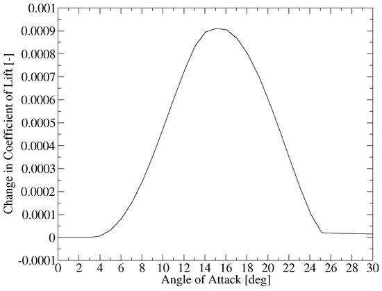 To explore the impact of detailed aerodynamic design, a synthetic airfoil polar generator was developed to model realistic improvements in lift and drag. Improvement in lift is parameterized as an improvement in the max by adding the perturbation function shown in Figure 8 to alter the . The magnitude of the perturbation shown in Figure 8 gave the best quality gradients in this study. The improvement in drag was simulated by simply changing all the drag values accordingly.