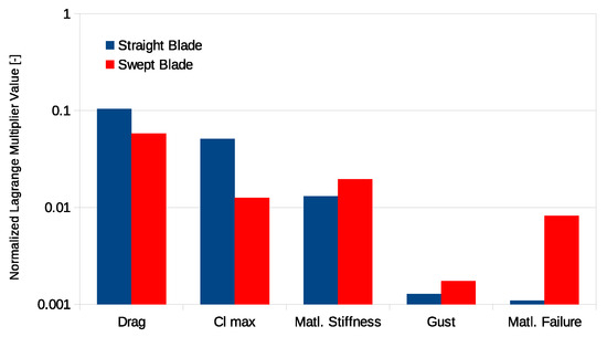 The swept blade results showed similar Lagrange multipliers as the straight blade, except that there is significantly less sensitivity in the blade root flap-wise bending moment constraint. This is due to the fact that the sweep reduces the loading at the outboard sections of the blade and thus reduces the bending moment. Furthermore, the increased design freedom of sweep shows that the design is moderately less sensitive to the remaining load constraints. However, since the load alleviation relies on blade deformation the design becomes increasingly more sensitive to material failure. The optimization did not include a cost model, so the mass constraint was added to avoid significant increases in the cost. The smaller Lagrange multipliers for this constraint in the swept blade optimization suggest that swept blades could be cheaper than conventional blades. Finally, the Lagrange multiplier on the sweep constraint is significant, suggesting that further improvement could be achieved if the blade was allowed to sweep more.
