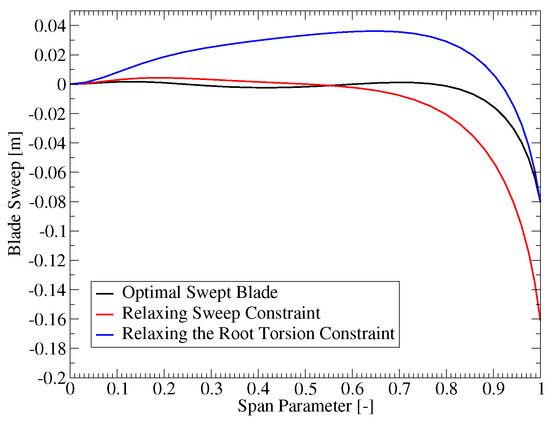 First, the updated blade designs indicated that the sweep limit and the blade root torsion moment constraint had the largest influence on the sweep. Figure 10 shows the direction that the sweep distribution would change if these two constraints were relaxed independently. The red curve shows how the sweep would change if the sweep limit was increased, while the blue shows how the sweep would change if the blade root torsion moment constraint was relaxed. When the sweep limit is increased, the sweep is increased accordingly without a major change in the shape (see the red curve in Figure 10). When the torsion constraint is relaxed, the optimization moves towards including a combination of both forwards and backward sweeps to increase the overall moment arm at intermediate sections of the blade (see the blue curve in Figure 10). Both changes would increase the bend twist coupling effect, thus, confirming that the blade performance could be improved with increased sweep.