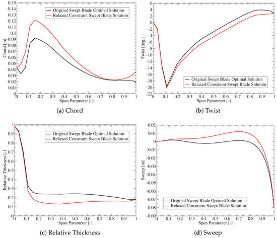 Table 1 indicates that the blade length is most affected by the thrust constraint. However, relaxing the thrust constraint would also change other design variables. One can use similar plots to investigate these additional changes, as shown in Figure 11. The plots show that the optimization would move to increase the chord. This would increase both the aerodynamic loading and the stiffness of the blade. To compensate for the increased aerodynamic loading, the twist is reduced by approximately overall. The increased stiffness allows the optimization to choose thinner airfoils that are more flexible but also more aerodynamically efficient. Since the plots are based on a single constraint being relaxed, the longer blade must still respect the same blade root flap-wise bending moment and tip deflection constraints. To achieve this, the optimization would introduce a combination of forward and backward sweeps to increase the bend twist coupling.