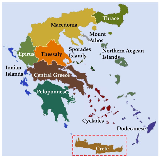 Location of Crete in relation to Greece (adapted from https://www.touropia.com/regions-of-greece-map/, accessed on 6 March 2022).