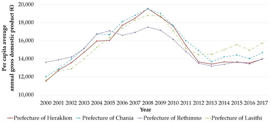 As it concerns the Cretan economic activity, tourism, commerce and agriculture–animal breeding constitutes an incredibly high percentage of 46% of the overall economic activity in the island. The evolution versus time of the per capita gross domestic product in Crete is illustrated in Figure 3, broken down as per the four prefectures of the island: Heraklion, Chania, Rethimno and Lasithi [48]. The effect of the economic crisis that has affected the Greek economy since 2008–2009 on the local economy of Crete is clearly depicted in Figure 3, although a promising upward trend has occurred since 2017.