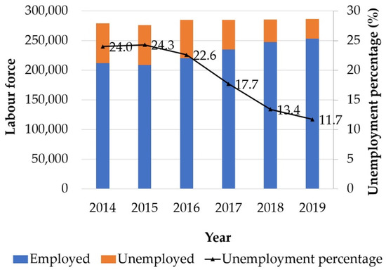 Finally, another interesting statistical feature is the evolution versus time of the unemployment percentage in Crete since 2014 (Figure 4) [49]. The clear trend towards a reduction in the unemployment percentage is clearly reflected in Figure 4 after 2015, owing to the gradual recovery from the economic crisis in Greece.