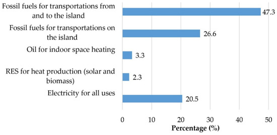 Based on the estimation of the annual final energy use per sector, the percentage share of each one is shown in Figure 5. An important finding is that the transportation sector from and to the island exhibited the highest share of the annual final energy use of the region, with the transportation on the island being the second highest consumer of energy.