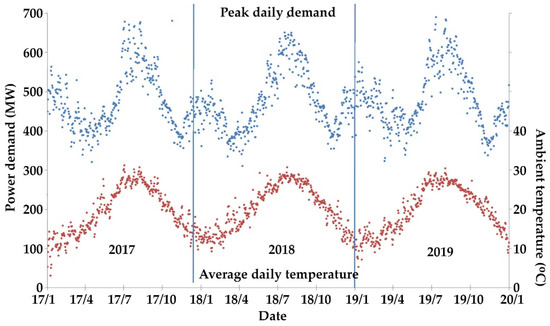 Electricity demand in Crete exhibits very intensive seasonal fluctuations due primarily to the effect of tourism which causes a sharp population increase and an increase in the associated activities mainly during the core touristic period from April to October, corresponding to 58% of the year. Electricity consumption is mainly attributed to the buildings sector, as can be seen in Table 1 (residential and tertiary sector). The major final energy use in buildings in the European Union is related to the heating and cooling needs of indoor spaces [58], the latter being very important for the climatic conditions on the island. This fact is also clearly depicted in Figure 6, which presents the annual variation of the peak daily power demand in Crete for three recent consecutive years (2017–2019) [50].