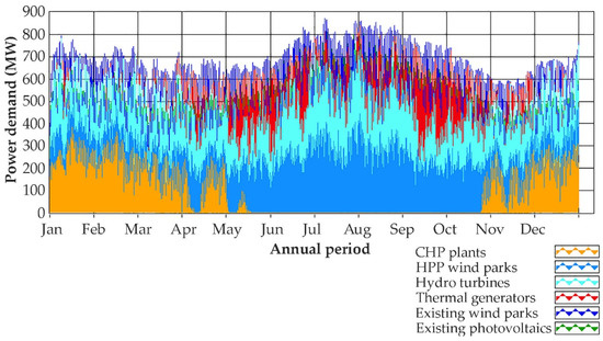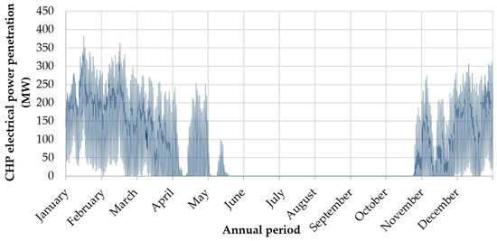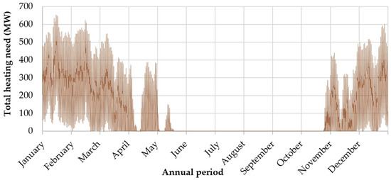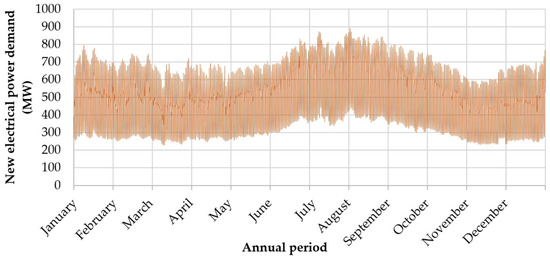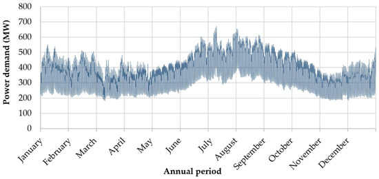 It is observed, as was expected, that the power demand in Crete is maximized during summertime, a noticeable boost which is obviously due to tourism and the need for cooling, while there is a slight increase too during winter time. This slight increase in the wintertime energy consumption is attributed to the gradual transfer of the heating needed to obtain full coverage from the conventional to the alternative heating technologies and specifically from oil-fired boilers to the heat pumps. The seasonal fluctuation in the power demand is also depicted in the annual power demand time series of 2019 (Figure 7).