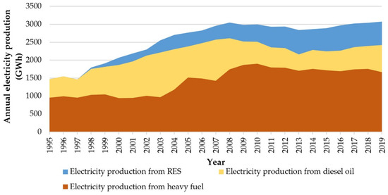 Evolution of the annual electricity production in Crete from the involved energy resources (1995–2019) [50].