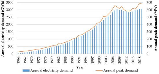 Evolution of the annual peak demand and the annual electricity consumption in Crete since 1964 [50].