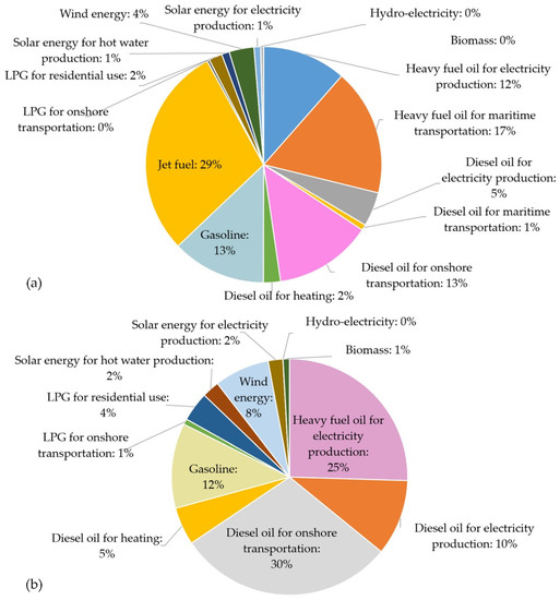 Percentage contribution of energy sources for the final energy use in Crete (a) for the overall energy sectors, (b) only for the onshore energy sectors.