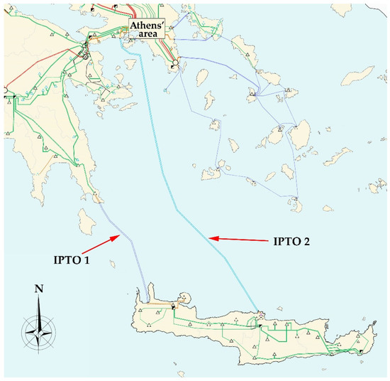The two routes (IPTO 1 and IPTO 2) of the national electrical interconnection of Crete with the mainland grid of Greece [67].
