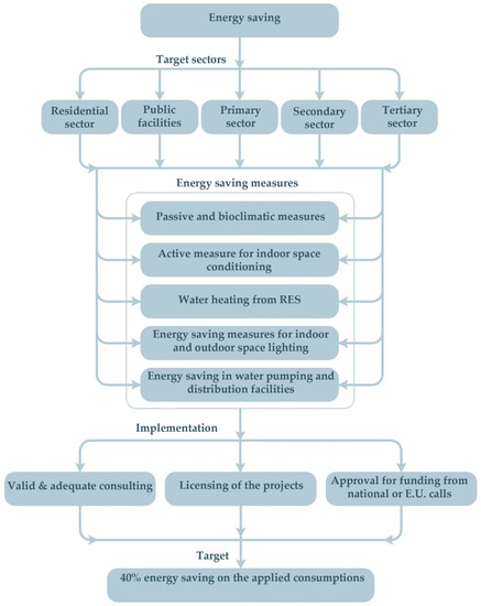 - The annual electricity consumption was provided by the local utility company (Hellenic Electricity Distributor Network Operator—HEDNO) [50]. The distribution of the electricity consumption per sector was found in the Hellenic Statistical Authority [51];