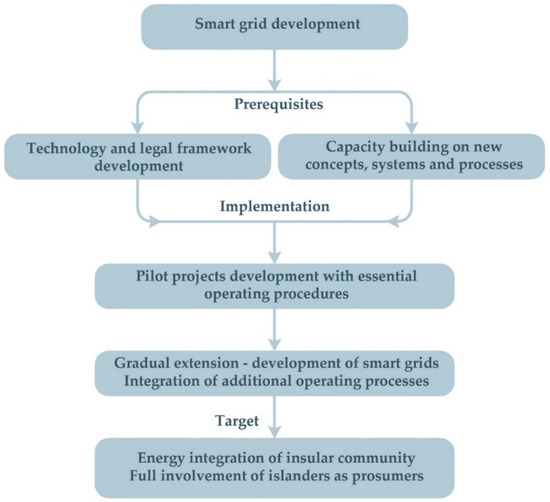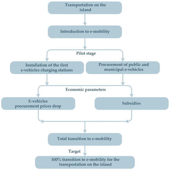 In a more integrative approach, the introduction of smart grids has been studied, promoting the active participation of final consumers through Demand Side Management (DSM) strategies and the overall treatment of all final energy consumption sectors (commercial, residential, transportation, etc.) in the electrical smart grid [32,33,34]. The first insular smart grid in Europe has already been constructed and developed in the Greek island of Tilos, funded by the European Commission in the frame of the H2020 TILOS project [35]. It combines the operation of a small hybrid power plant, consisting of a wind turbine, a photovoltaic park and an electrochemical storage plant, with the introduction of essential DSM strategies in the local settlements [36,37].