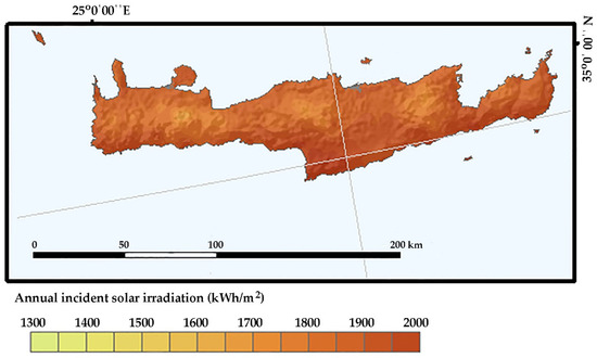 Crete is the biggest island in Greece (8336 km2) and the fifth in size in the Mediterranean basin, with a population of 634,930 inhabitants [46]. It is located between the geographical longitudes from 23°30′ E to 26°22′ E and latitudes from 34°53′ N to 35°42′ N. The island’s length from the eastern to the western coast is approximately 260 km, while its width from the northern to its southern coast ranges between 12 km and 60 km. The island’s coastline has a total length of approximately 1000 km. The location of Crete in relation to Greece is depicted in Figure 1.