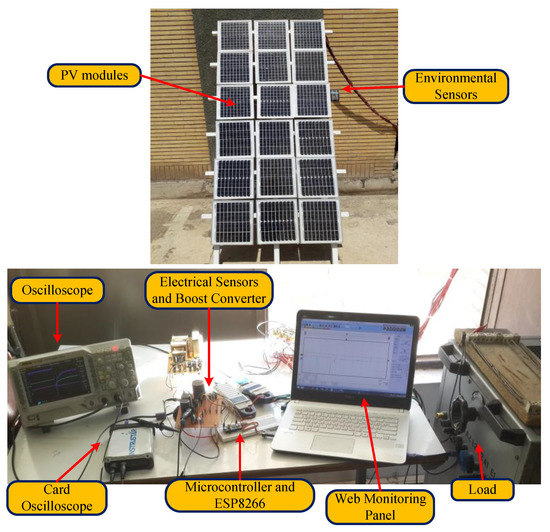 Figure 2 provides an in-depth overview of how the proposed monitoring system has been arranged. In this experimental research, a stand-alone PV system has been deployed to test and analyze the performance of the IMS. As shown in Figure 2, the designed IMS consists of PV modules, microcontrollers, a data logger, and sensors with wired connections. The equipment used in hardware section include 18 PV modules with 10 W total output power, a resistance load, an access point, mini-Wi-Fi device based on ESP8266EX, a microcontroller, and different sensors, which have been listed in Table 1. By using the presented IMS structure, different PV monitoring tasks, e.g., data collection, can be done quickly and efficiently through the connected microcontroller to a computational system via the internet.