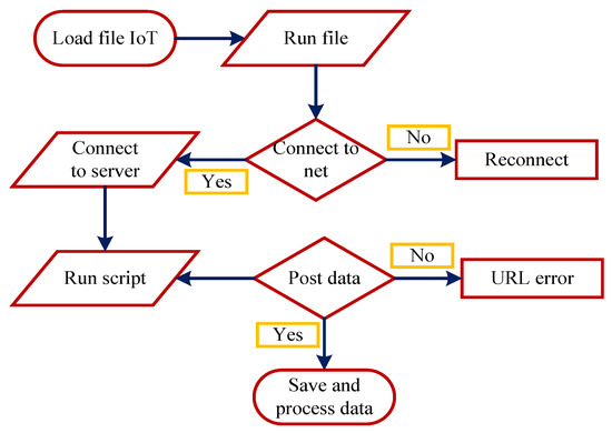 The IoT is a new technology that is envisioned as a global network of interconnected machines, devices, objects, people, and even animals interacting with each other and transferring and sharing data over the network. IoT technology is one of the most important technologies in the future and has attracted the attention of a wide range of industries [34]. A flowchart demonstrating the process of the IoT platform process in the proposed IMS is provided in Figure 3. In the first step, the IoT file is loaded by the microcontroller. The IoT file includes posts and gets commands for data transfer between the cloud and the microcontroller. After uploading the file to the microcontroller, using an Internet connection, the system then connects to the server and executes the script (.js file) on the server. In case the connection is lost, the platform starts transferring data from the microcontroller to the server again for recording and processing. If the data transfer fails, an URL error will be displayed to the user.