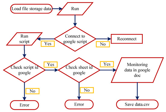 Cloud data loggers communicate over the Internet connection with a remote cloud-based server, which can be deployed anywhere in the world. The cloud-based server uses the cloud data logger as a container for recording data. Users can take advantage of any devices supporting a web browser to access data on the cloud. This paper proposes a new structure for the data logger based on an open-source and lightweight software and a customized cost-efficient hardware. Figure 5 shows the steps of the data logger used in the IMS as a flowchart. In the first step, the data logger loads the file in .c format and later on, the file is executed on the microcontroller. The next step is to connect to Google Script. If there is any problem with the connection, the system tries to reconnect to the server. Later on, the script is executed by Google Cloud, so that the ID related to the storage file is checked with Google ID. If the IDs are the same, the microcontroller is connected to the cloud, otherwise, the URL error will be displayed. Finally, the system checks the authenticity of the ID. Once the ID is correct, it starts receiving data from the microcontroller. The data is recorded as a CSV file and displayed on the Google Sheet simultaneously.