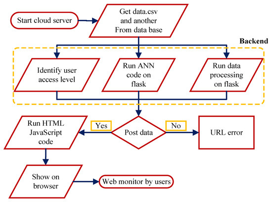 The term ‘Web monitoring’ signifies the process in which the information that end-users can interact with on a website or a web application via the internet is systematically analyzed and displayed (See Figure 6 for a general overview of a web monitoring process). Accordingly, the cloud server loads the scripts, which is followed by receiving a CSV-format version of the data file from the database and subsequently posting it to the backend for further processing. The backend is responsible for running programs in scripting languages like Python. The task includes execution of the ensemble learning algorithms code on the flask, users’ identification, and data processing in the backend. Finally, the processed data is displayed in the frontend. The task of the frontend layer is to run web languages such as HTML, CSS, and JavaScript in web browsers. Figure 7 shows the overview of the frontend layer used for data display to users. If the error occurs in the process layers, the user receives the URL error through the browser.